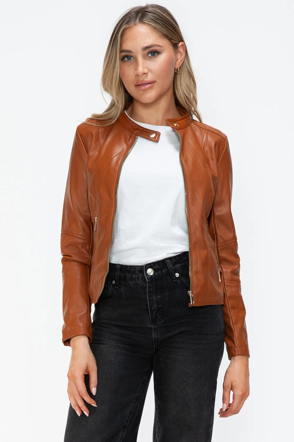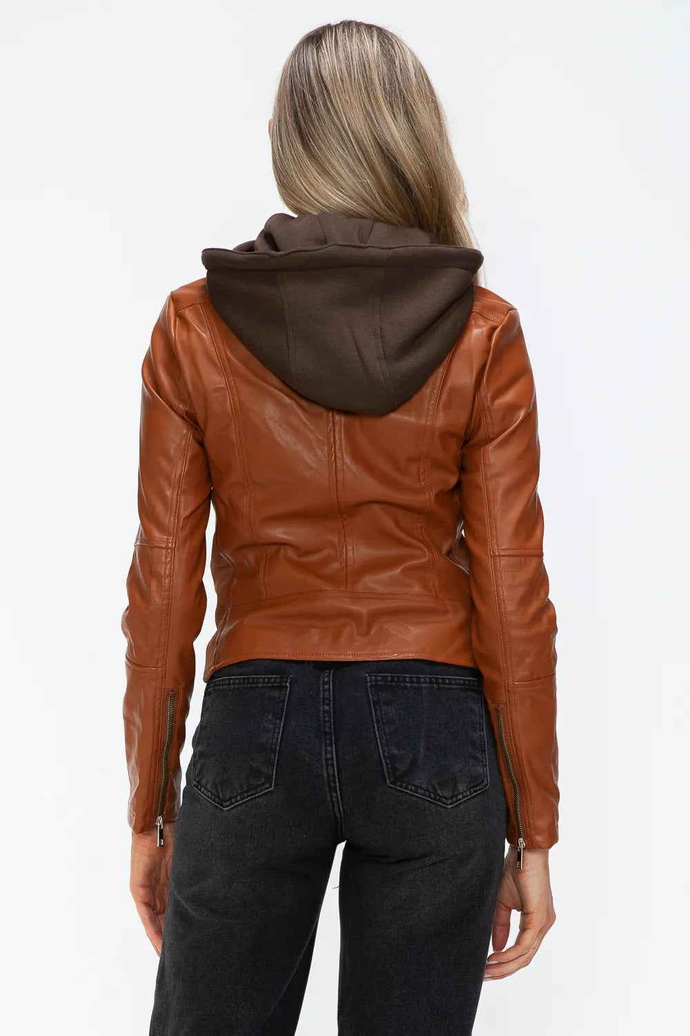 Snobbish Faux Leather Zip Up Drawstring Hooded Jacket